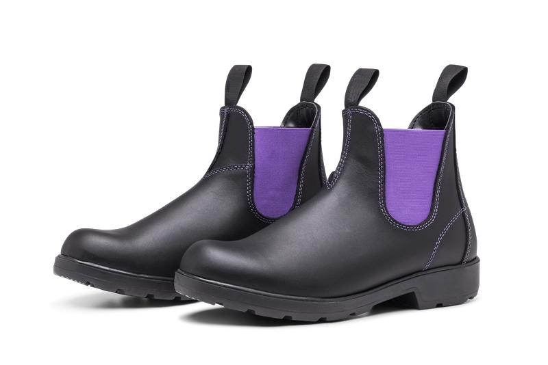 Lækker klassisk Chelsea Boot i sort læder med lilla elastik, som er fremstillet i Italien.